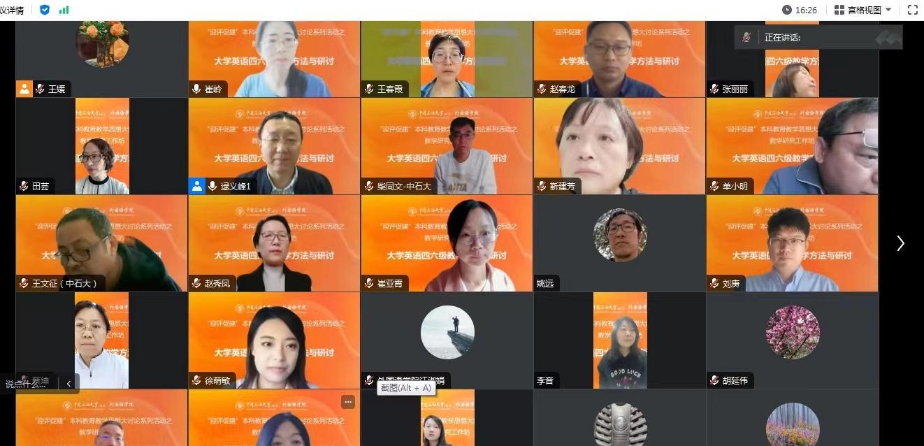 为深入学习贯彻党的二十大精神,全面落实立德树人根本任务,迎接新一轮本科教育教学审核评估工作,深入开展本科教育教学思想大讨论,10月26日下午,外国语学院邀请华南理工大学教授崔玲在线开展了题为“大学英语四六级教学方法与研讨”的讲座。学院院长赵秀凤、副院长逯义峰、公共英语教学部全体教师、英语系部分教师参加讲座,逯义峰主持讲座。