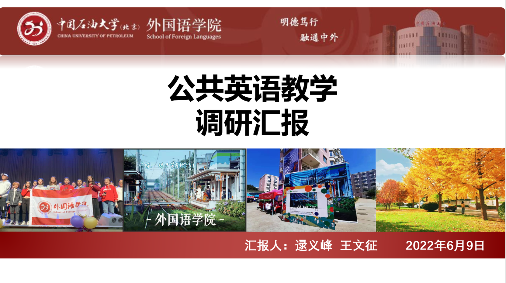 逯义峰副院长首先介绍了公共英语教学改革的背景,并汇报了对相关高校调研情况。他从学时学分、分级教学、教学内容等方面,介绍了前期对十余所兄弟院校的公共英语教学调研情况。他指出,兄弟院校对我校以能源学术英语为特色的公共英语教学模式表示了肯定和支持;同时,兄弟院校公共英语教学的许多模式和方法,也为我校的教学改革提供了参考和借鉴。