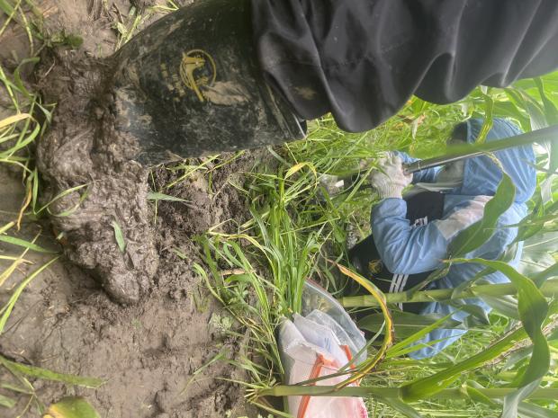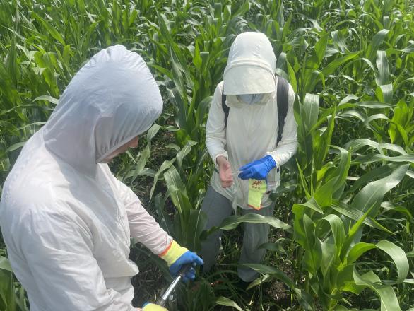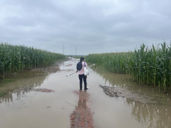 第一批采样期间,课题组师生面临了夏日多变的环境条件。天气多变,降雨频繁,导致道路泥泞不堪,车辆难以通行,给采样队伍的现场到达和样本转移带来了极大的困难。同时,东北地区的玉米高大且密集,穿行其中异常艰难,课题组熊驷骏、周鹏和宋恺媛同学依然坚持穿梭其中5天,完全手工采集20点60份样品。