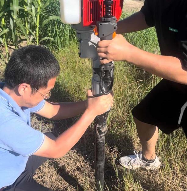 第二批采样期间,课题组熊驷骏、李安然和井亚洲同学及时调整采集思路,解决高温酷暑和蚊虫叮咬,探索否定半自动采样器和四轮小拖车,最终采用人工手钻取样、两轮野外拖车的方式,耗时9天完整采集一块无庄稼地块(草地)硬土质样品。