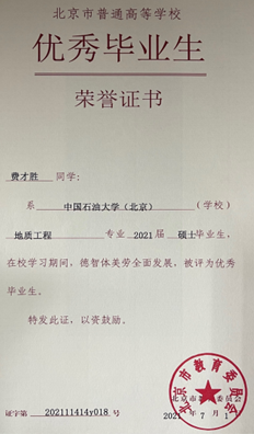 最近,由陈践发和万云洋教授共同指导的2018级硕士毕业生费才胜同学荣获2021年北京市普通高等学校优秀毕业生。费才胜同学在校期间,多次荣获各类奖项,如2020年硕士研究生国家奖学金、2019-2020年度中国石油大学(北京)三好学生、2019-2020年度中国石油大学(北京)优秀青年志愿者、2019-2020年度中国石油大学(北京)“优秀防疫志愿者”、2019年度首届盆地与油藏研究中心研究生学术论坛优秀展板奖、2018-2019年度中国石油大学(北京)优秀研究生、2018-2019年度中国石油大学(北京)优秀学生干部等。他将在中国石油大学(北京)继续攻读博士学位。