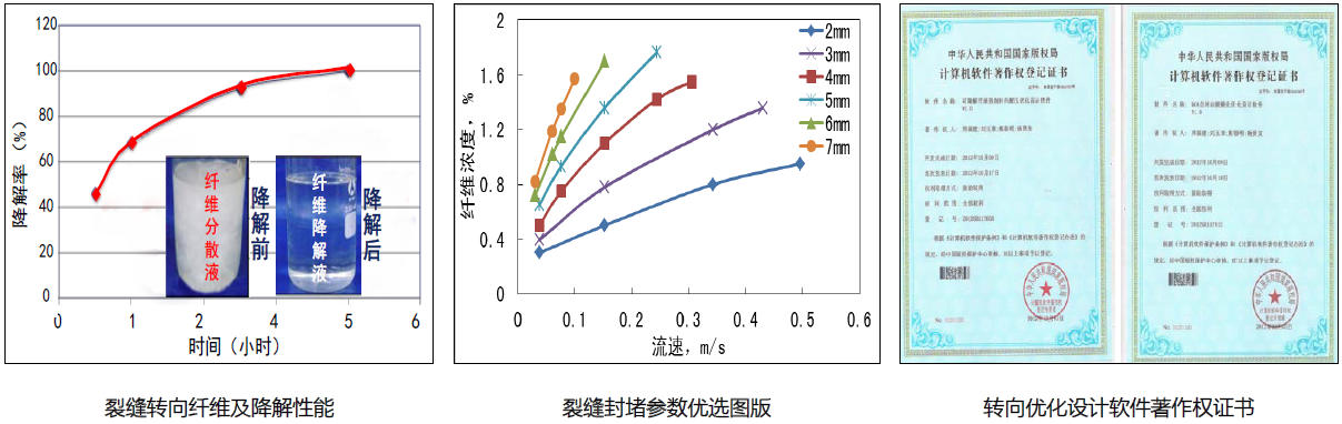发明了可降解聚酯纤维转向材料,纤维材料封堵能力20MPa以上,降解率大于99%。可满足60-160℃储层暂堵转向酸压需要;形成了转向酸压优化设计方法,并开发了优化设计软件。