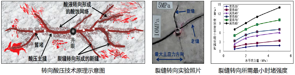 我国碳酸盐岩缝洞发育具有极强的纵横向非均质性,酸压改造必须沟通缝洞,并大范围酸蚀改造基质,才能高效建产。常规酸压通常沿最大水平主应力方向形成单一裂缝,酸压沟通缝洞几率低,酸蚀范围有限,增产效果不明显,改造有效率低于50%。依托中石油碳酸盐岩重大专项,经过近10年的“产学研用”联合攻关,解决了转向酸压理论、方法和材料等难题,形成了碳酸盐岩油气藏转向酸压技术,结合具有深度穿透和自转向功能的TCA和DCA酸液体系,现场进行工业化应用,获得国家发明二等奖1项。