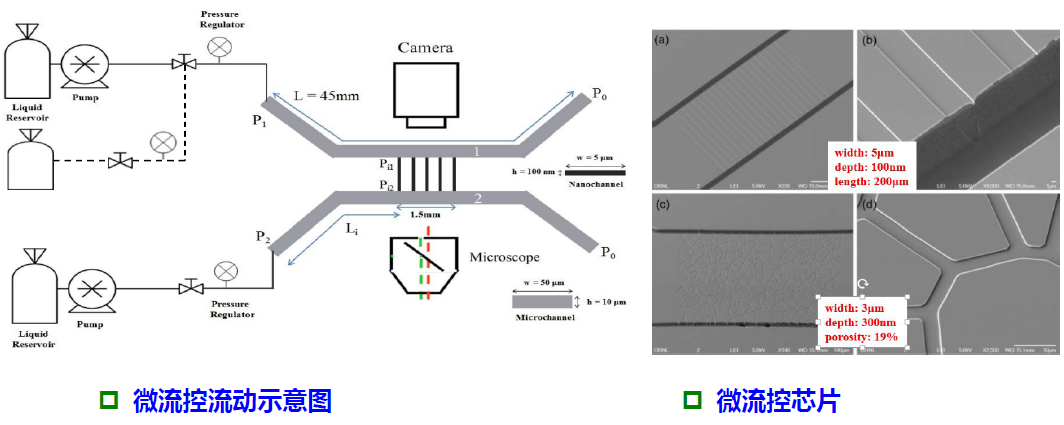 3.Lab-On-Chip微观可视化物理模拟,微纳尺度芯片(宽:1μm, 深:50nm)、微流控芯片油水多相流实验、纳尺度通道单相/两相驱替实验、水力压裂液微通道中减阻剂运移特征,实现常规及非常规微纳尺度渗流特征研究,揭示微纳尺度孔隙中微观渗流机理。