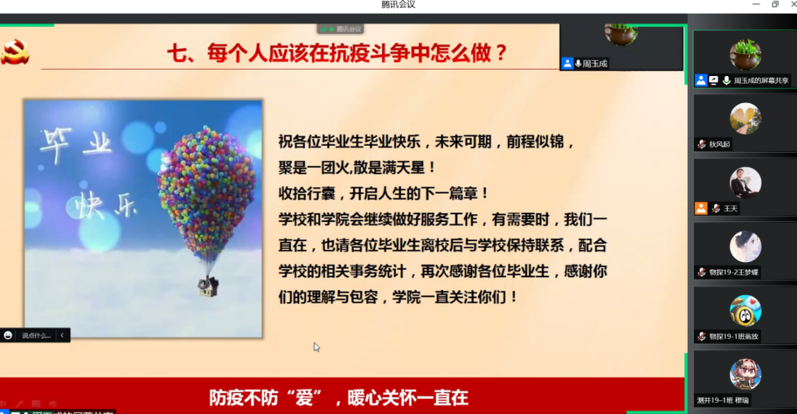 周玉成介绍了当前疫情及其影响下的外部环境;讲述了“动态清零”政策的必要性和科学性;从北京疫情的现实情况出发阐述了学校闭环管理的重要性;肯定了学院师生在学校闭环管理期间表现出的“肯吃苦、能干事、有担当”的精神风貌;表达了对毕业生的美好祝愿以及学院的关心关怀;展现了我们终将战胜疫情的决心和信心。