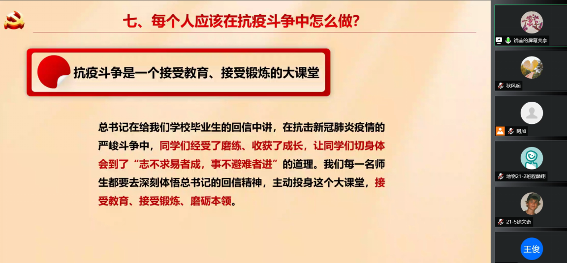 饶莹讲述了当前国内外的疫情形势,呼吁各位同学提高对疫情防控的重视,理解并支持学校各项防疫政策,多一些耐心,多一些体谅。她动员同学们牢记习近平总书记的回信精神,投身到抗疫斗争中,持续发挥中石大人的“硬核”担当,为学校的闭环管理作出力所能及的贡献,与学校一起努力,共克时艰,打赢这场疫情防控的硬仗。
