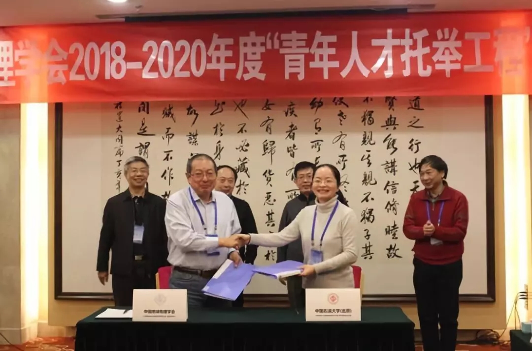 在学会理事长陈晓非院士、副理事长熊盛青教授、赵殿栋教授、张东宁研究员的见证下,郭建秘书长代表中国地球物理学会与被托举人才单位代表中国石油大学(北京)地球物理学院院长饶莹教授签订了托举协议并合影留念。