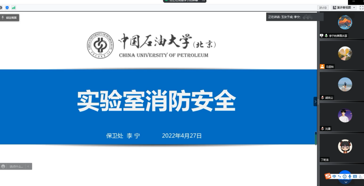 李宁讲述了引起火灾的主要原因,运用学校实验室火情火险的典型案例提高大家的重视;介绍了常见的消防设施器材,教育引导师生正确使用消防设施器材;重点讲解了火灾预防和发生火灾的处理方法,文字与视频相结合,校外案例与校内事故相联系,生动形象地讲述了关于实验室消防安全的注意事项,普及了消防安全常识,讲解深入浅出。