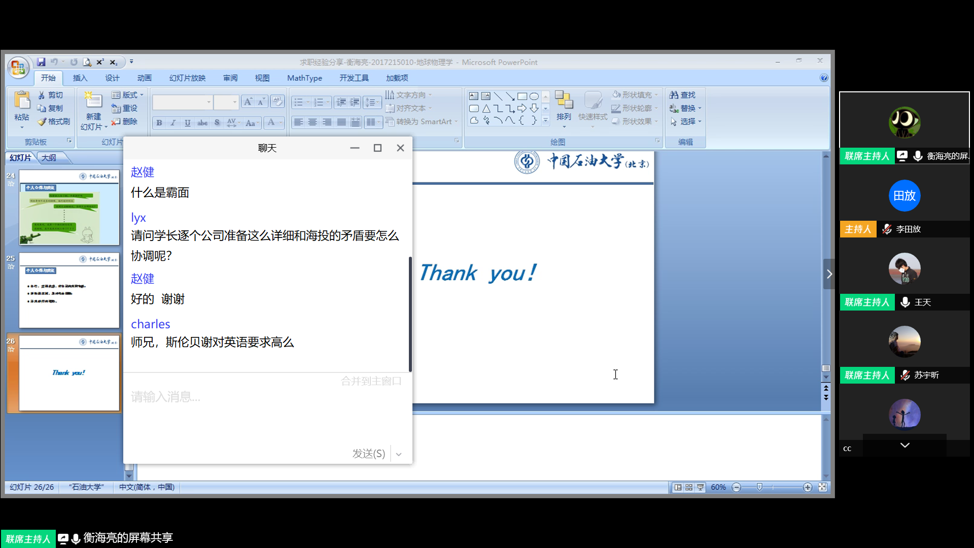 本次就业经验分享活动利用“腾讯会议”平台开展,活动邀请到地球物理学院地球物理学17级硕士研究生衡海亮和地质资源与地质工程17级硕士研究生苏宇昕担任主讲。来自全校各专业各年级近100名同学共同“线上”学习就业经验。衡海亮结合自己海投近千家单位和面试几十家单位的经验,分享了“如何进行行业选择”、“如何有针对性的制作和投递简历”、“笔试、面试应注意的问题”等内容。苏宇昕结合自己历经8个月紧张备考,半个月集中训练,做了3万道真题,磨坏3件衬衫,最终以笔试第一名的成绩被中华人民共和国外交部录用的宝贵经历,为大家分享了“公**的准备时间与节奏”、“笔试需要做哪些准备、怎样复习”、“笔试中行测部分与申论部分考试技巧”等方面的内容。整个活动期间,“线上”听众踊跃提问,气氛活跃,共留言200余条,两位主讲同学就“就业过程中英语水平的重要性”、“就业过程中心理调节”等方面问题与各位同学做深入交流。