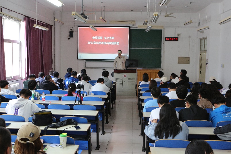 学院辅导员李田放为大家进行北京市征兵政策解读,他向同学们介绍征兵的各项条件标准和应征指南,并分析参军的益处,鼓励同学们到部队去接受锻炼和考验,为实现自己的人生价值而努力奋斗。最后他对同学们的提问进行详细解答,现场气氛活跃,反响热烈。