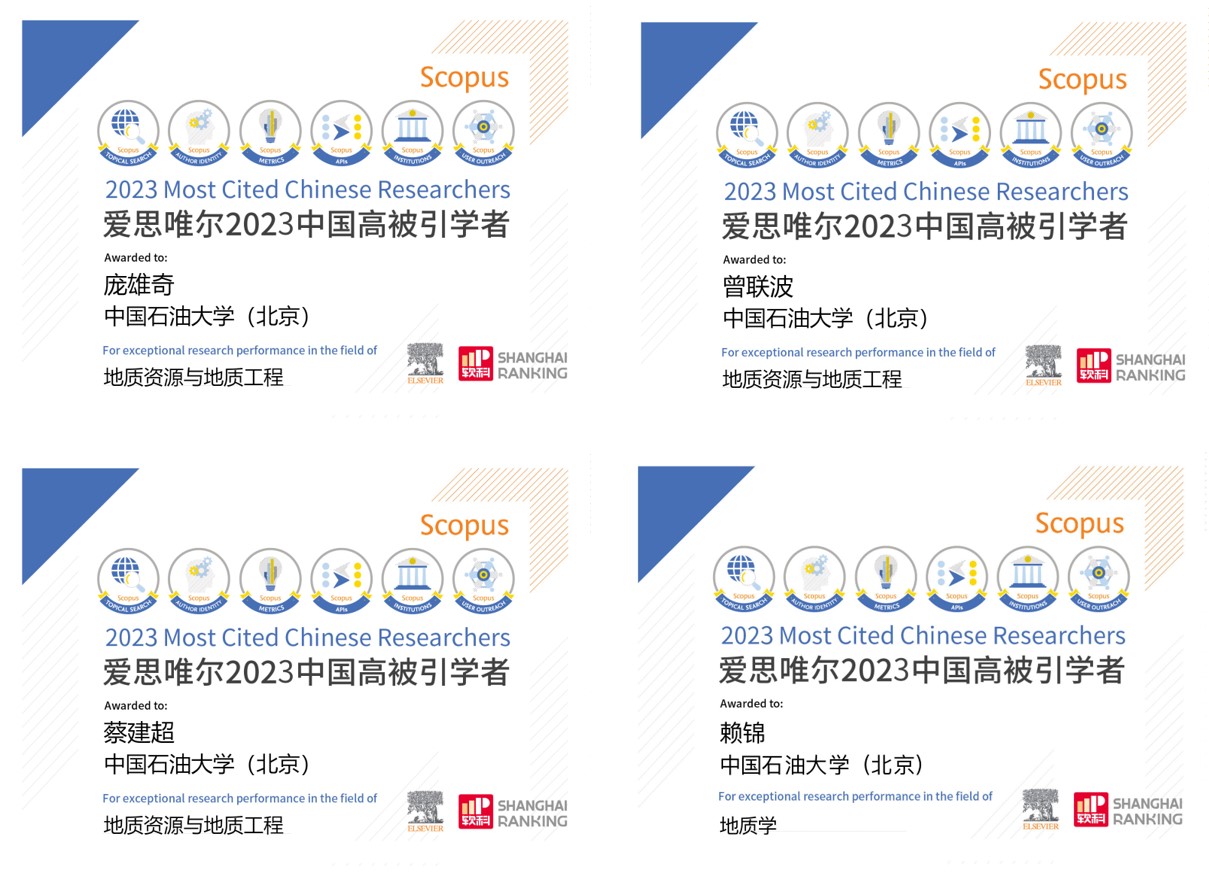 2024年3月27日,爱思唯尔(Elsevier)重磅发布2023“中国高被引学者”(Highly Cited Chinese Researchers)榜单。来自496所高校、企业及科研机构的共计5801人入选,覆盖了教育部10个学科领域、84个一级学科。其中,中国石油大学(北京)共有20名学者入选,我院庞雄奇教授、曾联波教授、蔡建超教授和赖锦老师入选此次榜单。