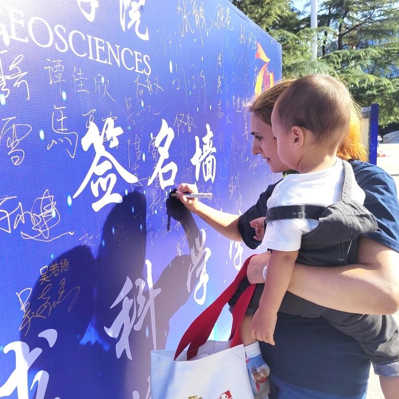留学生校友2016博士古娜依携带家人共同返校,现就职于涿州物探局作为博士后,作为优秀的地学院校友,古娜依十分开心能够返回校园加入到七秩校庆活当中来,并在签名墙上为我们留下了值得纪念的一笔。