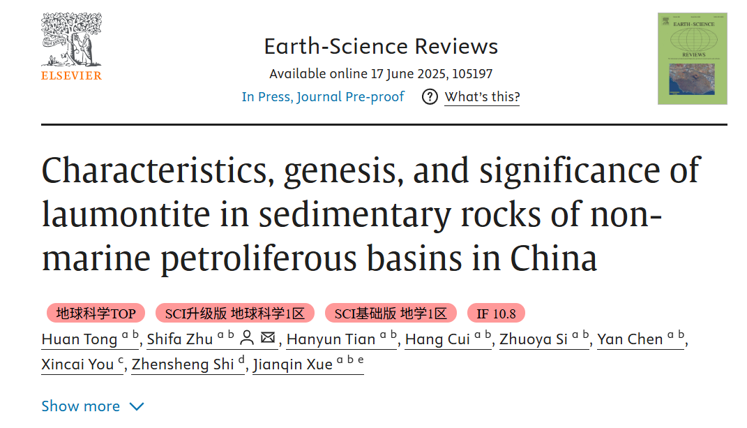 该研究成果《Characteristics, genesis, and significance of laumontite in sedimentary rocks of non-marine petroliferous basins in China》发表在地学著名期刊《Earth-Science Reviews》上。论文通讯作者为朱世发教授,第一作者为我院2023级博士研究生佟欢,中国石油大学(北京)油气资源与工程全国重点实验室和地球科学学院为第一完成单位。