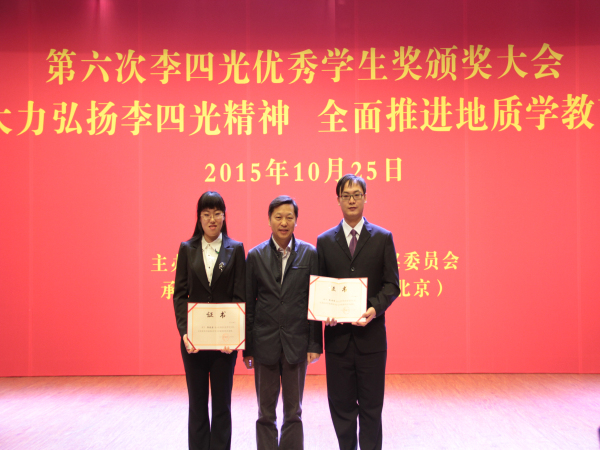 “第六次李四光优秀学生奖”共表彰了18位求学期间在地质类专业领域上突出的学生,国土资源部部长姜大明为他们颁奖并亲切交谈。我校地学院12级硕士生张佳佳和12级本科生张毅颖分别获得“李四光优秀硕士研究生奖”和“李四光优秀大学生奖”。张佳佳专业基础扎实,勤于思考,勇于创新,目前已发表学术论文7篇,其中国内SCI1篇,以第一作者发表国际三区SCI论文一篇,同时以第一作者发表两篇国际重要会议论文。张毅颖学习成绩优异,是北京市三好学生和“先锋杯”优秀团员,本科三年,共获得5项国家级奖励,4项省部级奖励,10项校级奖励,以第一作者发表两篇学术论文。