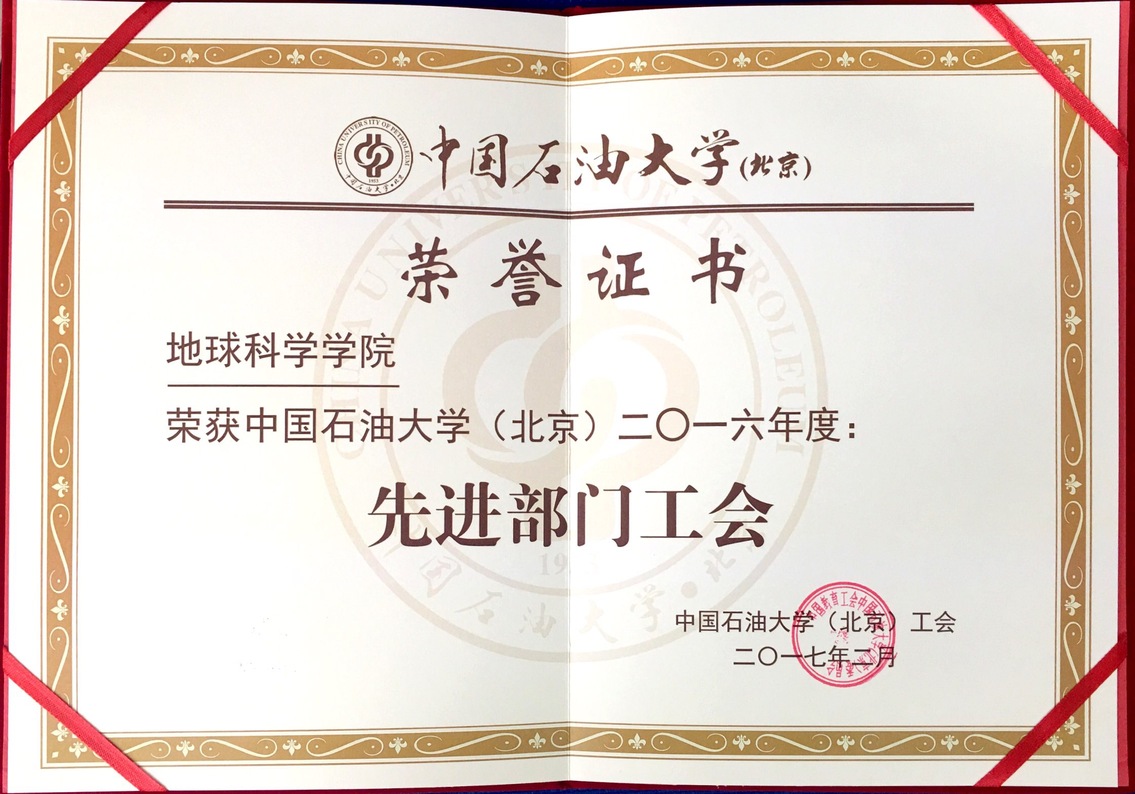 近日,中国石油大学(北京)工会为表彰2016年先进部门工会以及在工会工作中做出优异成绩的先进个人,按照先进部门工会、特色工作奖、优秀工会干部和工会积极分子的评比条件,组织相关奖项评选并召开2016年度工会工作表彰大会。地球科学学院工会获校2016年度工会工作“特色工作奖”及“先进部门工会”荣誉称号。此外,王贵文等6位教师获“工会积极分子”称号,余一欣等3位教师获“优秀工会干部”称号。