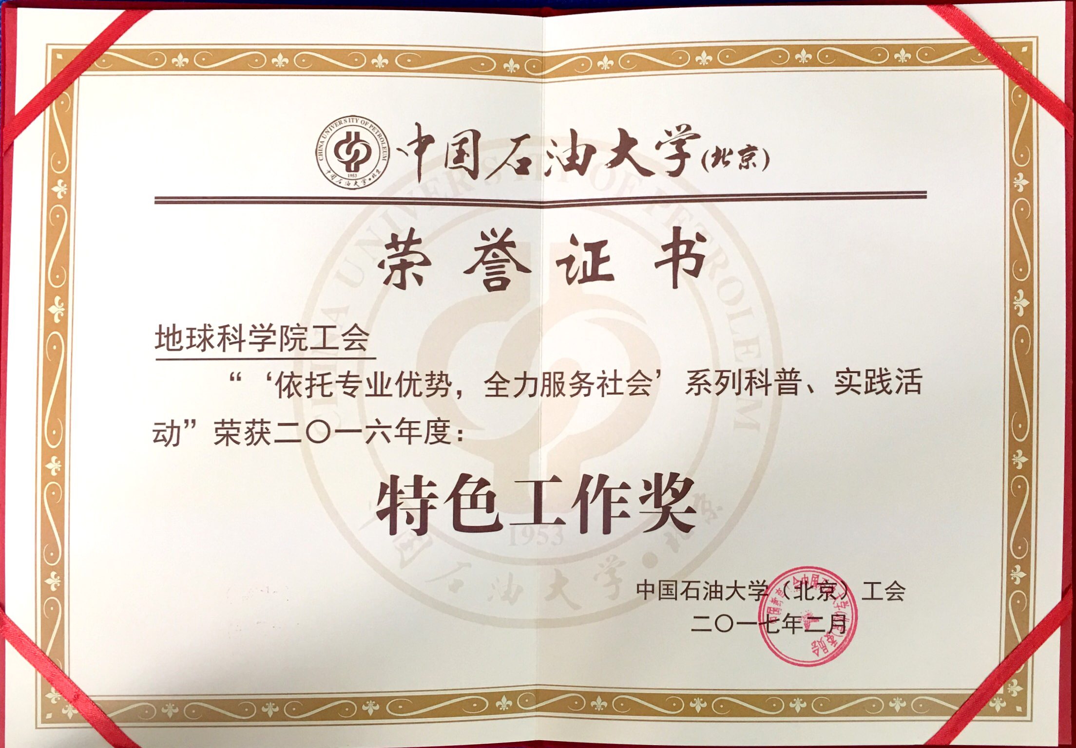 我院工会获2016年中国石油大学(北京)工会“特色工作奖”及“先进部门工会”荣誉称号