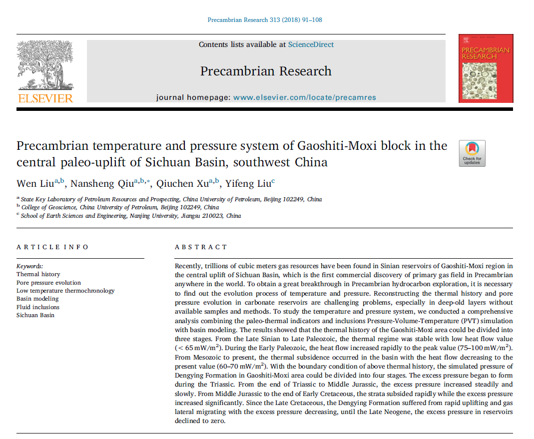 近日,我院邱楠生教授研究团队在沉积盆地古老海相碳酸盐岩地层温压场研究方面取得重要进展。研究成果《Precambrian temperature and pressure system of Gaoshiti-Moxi block in the central paleo-uplift of Sichuan Basin, Southwest China》发表在地学著名期刊《Precambrian Research》上。论文通讯作者为邱楠生教授,第一作者为我院2014级博士研究生刘雯,其余作者徐秋晨、刘一锋均为邱楠生教授团队博士生,中国石油大学(北京)油气资源与探测国家重点实验室和地球科学学院为第一完成单位。《Precambrian Research》是地球科学领域的一区TOP期刊,拥有较强的学术影响力,期刊重点出版地球和临近行星早期组成、结构以及演化相关的前沿科学报道,近5年平均影响因子为4.657。