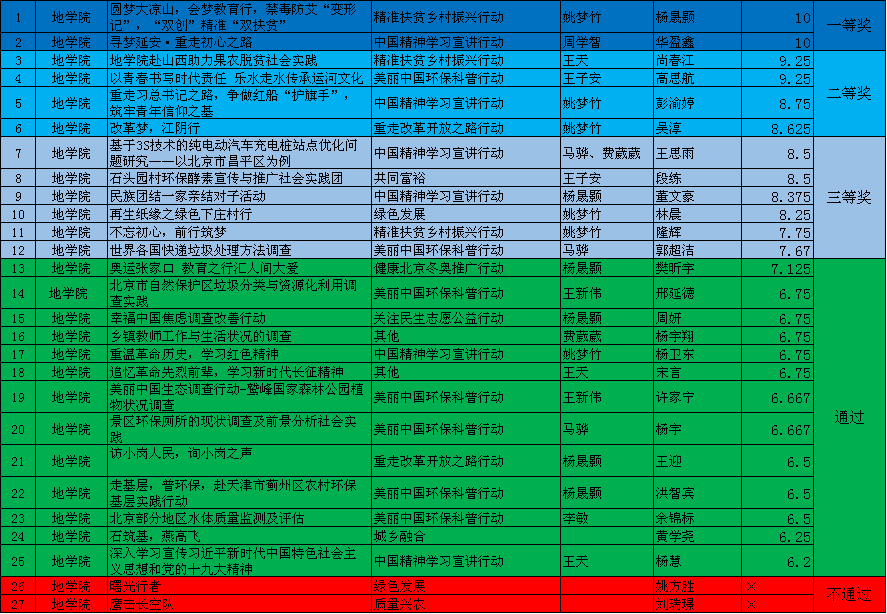 地球科学学院深入学习贯彻习近平总书记系列重要讲话精神,深入贯彻落实中国共产主义青年团第十八次全国代表大会上的报告,按照上级团委有关要求,引领教育广大青年学生勇做担当民族复兴大任的时代新人,以实际行动助力精准扶贫,服务乡村振兴战略,切实在感受改革开放40年取得的新成就新面貌的生动实践中受教育、长才干、作贡献。学院组织社会实践团队在暑期开展了形式丰富、内容多样的社会实践活动,涉及方向涵盖了“重走改革开放之路行动”、“中国精神学习宣讲行动”、“精准扶贫乡村振兴行动”、“关注民生志愿公益行动”、“美丽中国环保科普行动”、“健康北京冬奥推广行动”等多个主题,其中“寻梦延安,重走初心之路”社会实践团入选全国大学生延安实践专项行动百强团队,“圆梦大凉山,绘梦教育行”暑期社会实践团入选“青年服务国家”首都大中专暑期社会实践百强团队,“以青春书写时代责任,乐水走水传承运河文化”暑期社会实践团入选北京高校师生服务首都“四个中心”功能建设“双百行动计划”团队。各实践团队分赴四川凉山腹地、延安革命老区、新疆国际大巴扎、北京古运河及乡村等地,以实践的脚步丈量祖国大好山河,以奋进的热情唱响铁人青春赞歌。经过积极认真的准备,各实践团在答辩中展现出良好的精神面貌和扎实的实践成果。经过认真评选和讨论,杨晟颢带领的“圆梦大凉山,绘梦教育行”社会实践团和华盈鑫带领的“寻梦延安·重走初心之路”社会实践团获得暑期社会实践优秀团队一等奖,尚春江、高思航、彭渝婷、吴淳带领的实践团获得暑期社会实践优秀团队二等奖,王思雨、段练、董文豪、林晨、隆辉、郭超洁带领的社会实践团队获得暑期社会实践优秀团队三等奖。具体答辩结果如下: