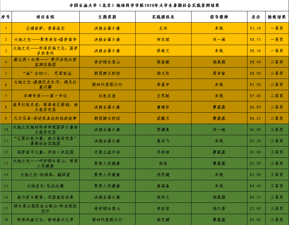 9月17日,地球科学学院2020年暑期社会实践结题答辩会在地质楼1105会议室举行。答辩会邀请地球科学学院党委副书记周学智以及辅导员代表作为评委,兼职辅导员朱锐主持本次答辩。答辩会通过了43支社会实践团队的结题答辩并评选出地球科学学院暑期社会实践优秀成果一等奖3支、二等奖6支、三等奖9支以及优秀团队16支。