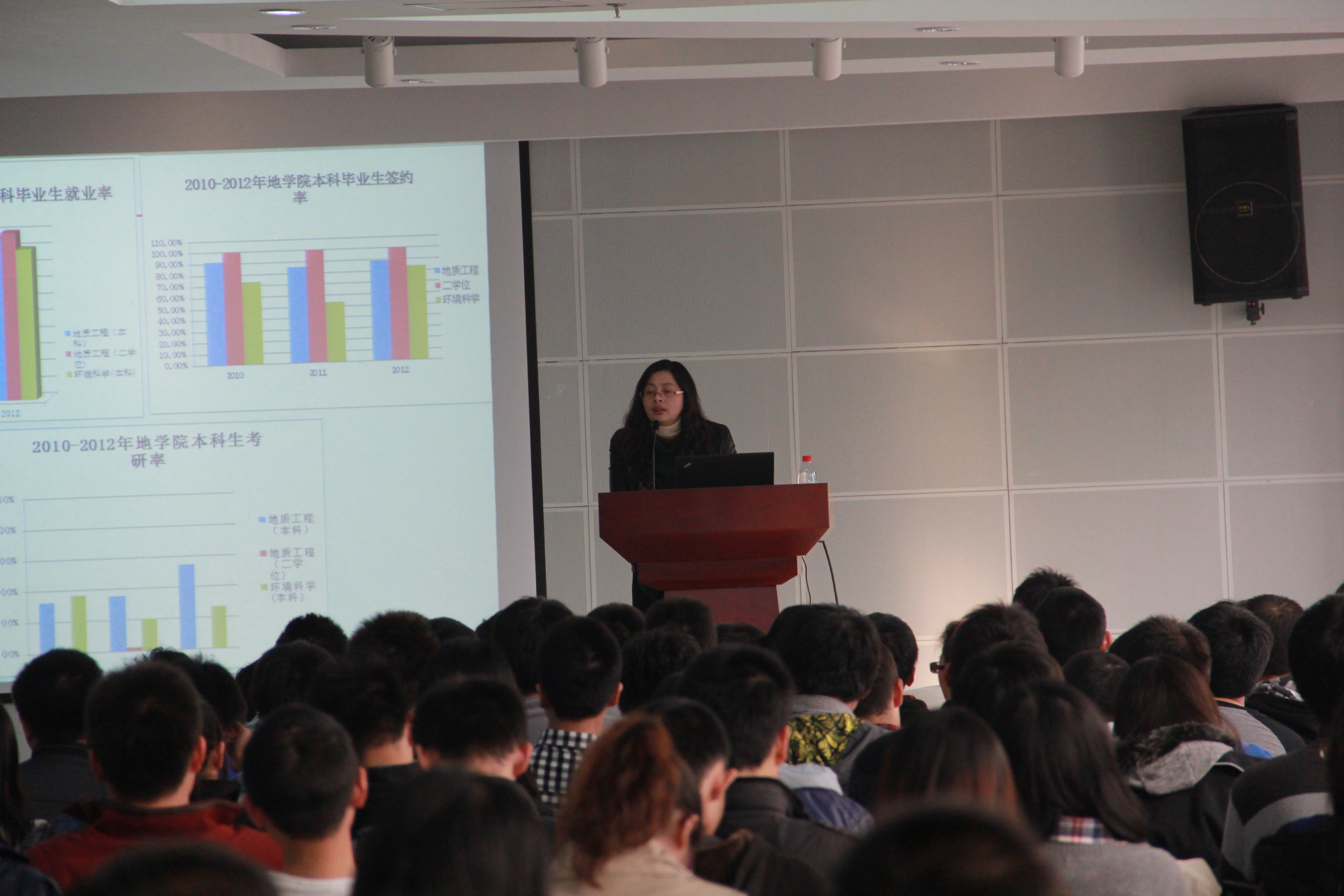 2012年10月25日下午,地学院于校活动中心就业报告厅召开2013届毕业生就业动员大会。我校就业指导中心朱义清老师、地学院党委副书记陈冬霞老师以及2013届全体毕业生参与了此次会议。