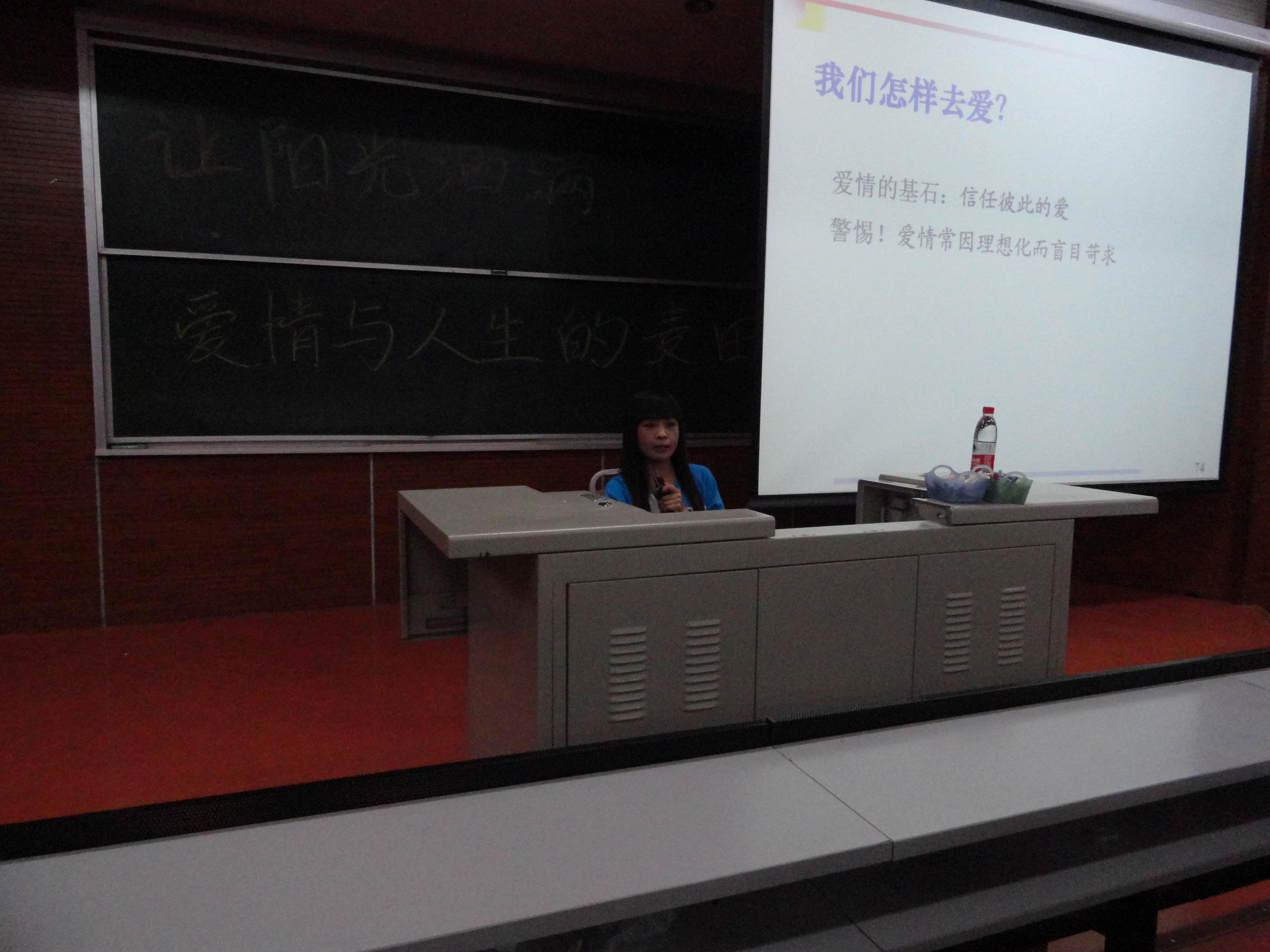 11月18日晚,“让阳光洒满爱情与人生的麦田”主题讲座在第二教学楼101教室举办,此次讲座邀请到我校马克思主义学院韩丽紘老师主讲,由我院研究生会承办。