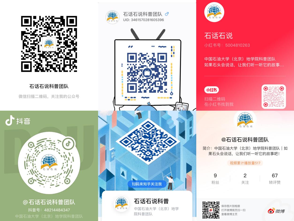 除此之外,石话石说科普团队还制作了一系列线上地球科学科普视频发布在公众号、Bilibili视频网站、小红书等主流媒体。未来,团队将继续结合自身特点及优势,充分利用国家重点实验室平台,与地球科学学院的李四光讲师团一起,提高中小学生的地球科学素养、宣传中国石油大学(北京)地球科学学院、共同促进大中小科普教育一体化。