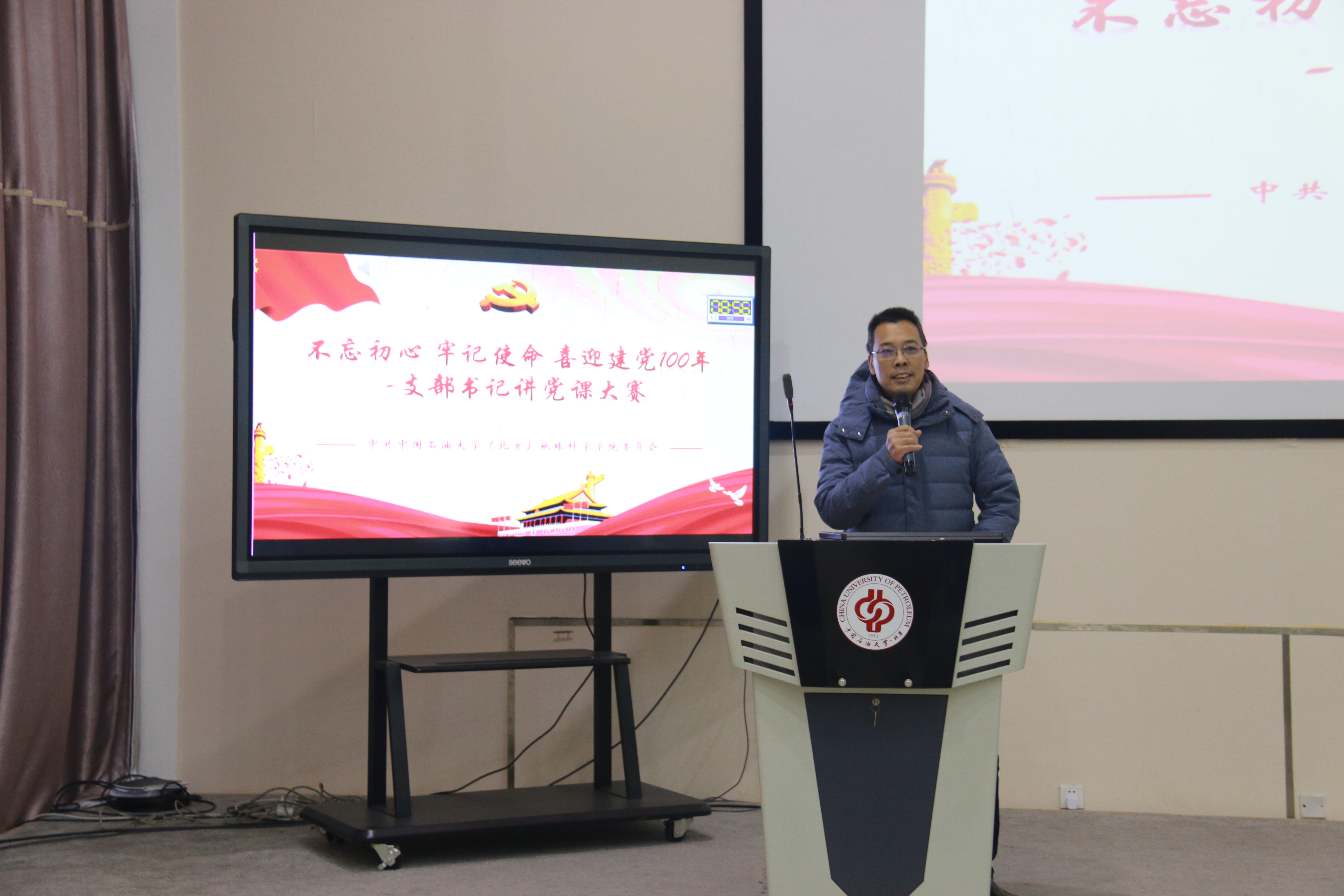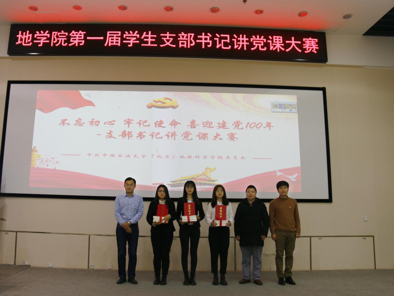 为深入学习党的十九届五中全会和习近平总书记给我校克拉玛依校区毕业生重要回信精神,进一步提升师生党员的党建理论水平和业务素质,12月10日下午,地球科学学院党委举办“不忘初心、牢记使命,喜迎建党一百年”第一届学生支部书记讲党课大赛。中国石油大学(北京)党委组织部部长梁喜书、党委宣传部副部长张延港、学生工作处副处长戴兵、地球科学学院党委书记王贵文、党委副书记周学智及各教工支部书记或支委参加大赛并担任评委,地学院90余名学生支部书记和委员现场观摩了比赛。