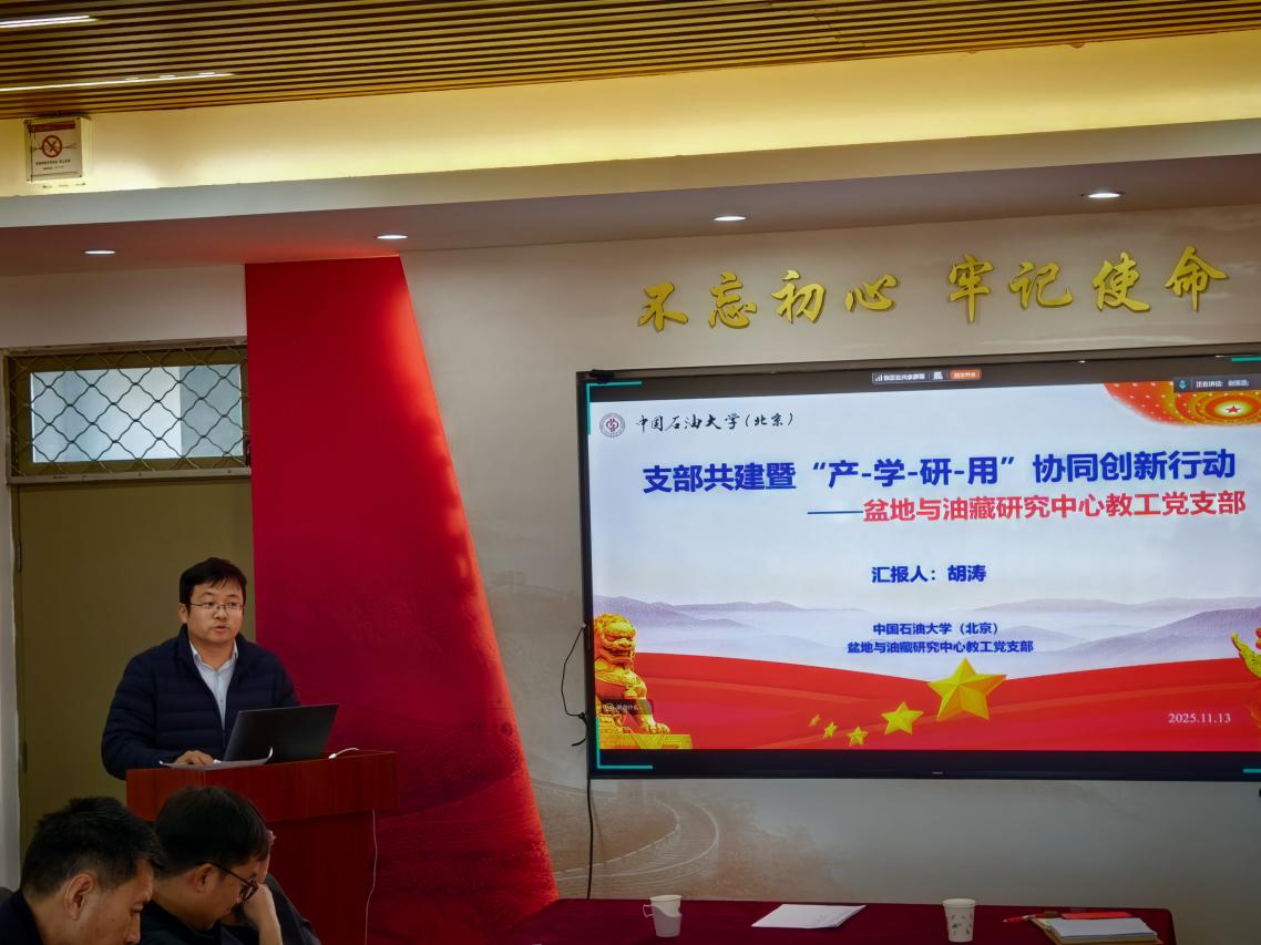 2025年11月13日,地球科学学院盆地与油藏研究中心教工党支部联合中国石油勘探开发研究院气田开发所党支部、延长石油集团研究院开发所党支部、学校期刊社党支部、“砥砺研思”油气成藏定量分析科研攻关研究生党支部,在地质楼1101会议室共同举办“强国行:同题共答,能源先锋——支部共建暨‘产-学-研-用’协同创新行动”组织生活。地学院党委书记刘钰铭、副院长罗情勇及各共建单位党支部代表出席会议。