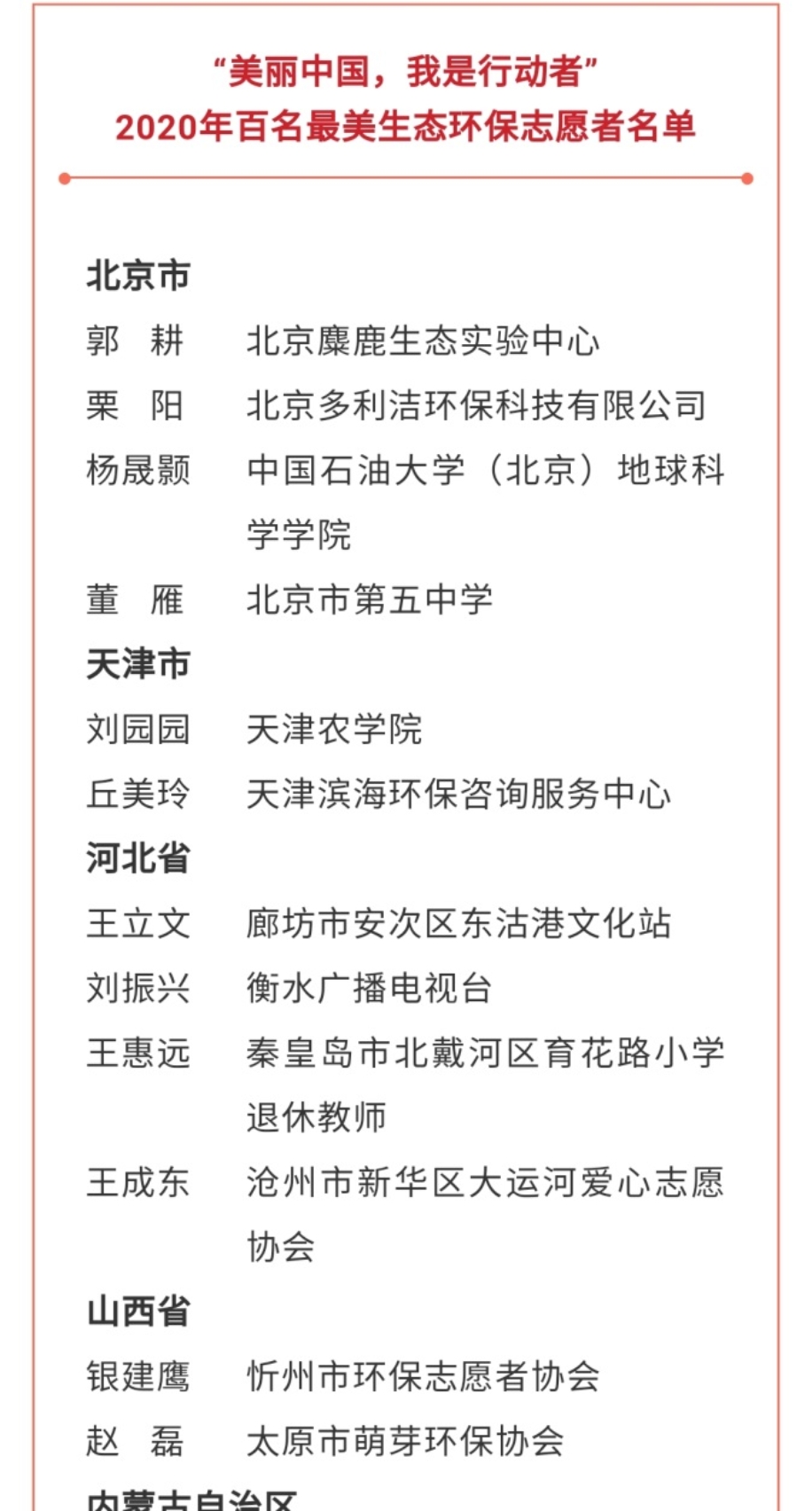 据悉,2020年“美丽中国,我是行动者”百名最美生态环保志愿者推选活动启动以来,社会各界积极参与,通过各省级生态环境部门统一推荐了最美生态环保志愿者候选人152名,覆盖政府部门、企业、学校、社区、农村、环保社会组织等领域。经过网络投票和专家评审,生态环境部推选出“最美生态环保志愿者”101名。