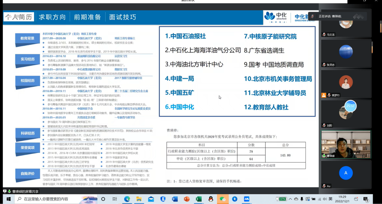为进一步帮助毕业生了解就业形势,找准定位,树立求职就业信心,促进学生高质量就业,地球科学学院于12月1日晚19:00以线上腾讯会议的形式成功举办“就业速“地”--优秀校友就业经验分享会第二期,基层就业创业校友论坛。本次就业经验分享会邀请了三位优秀校友张灵志、曹瑛倬、金哲宇,为2022届毕业生开展本专业找工作的相关经验和求职方面的技巧等交流。