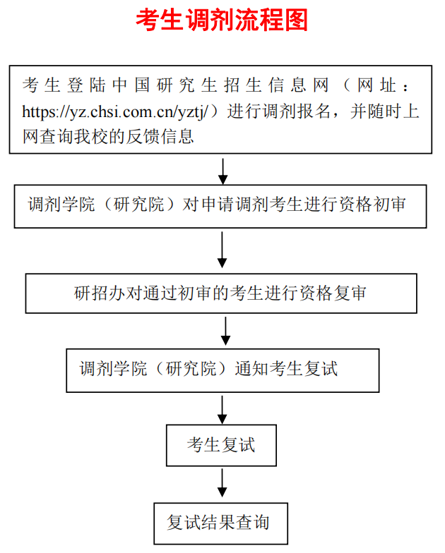 严格按照教育部关于印发《2021年全国硕士研究生招生工作管理规定》的通知(教学函〔2020〕8号)“第九章 调剂”部分的相关要求执行。