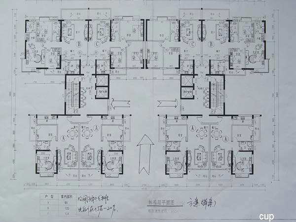 考虑到房屋的采光、通风、居住空间舒适度等因素,将原来建筑面积172平米和143平米的二种户型设计改为建筑面积108平米(图中的A户型)、125平米(C型)和144平米(B型)三种户型,户型示意图如下所示: