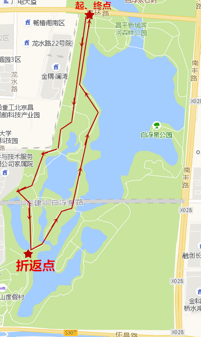 行走路线:滨河公园南园西侧往返一周(见附件),全程5公里,途中设有引导员引导并在不同位置发放两张路卡。