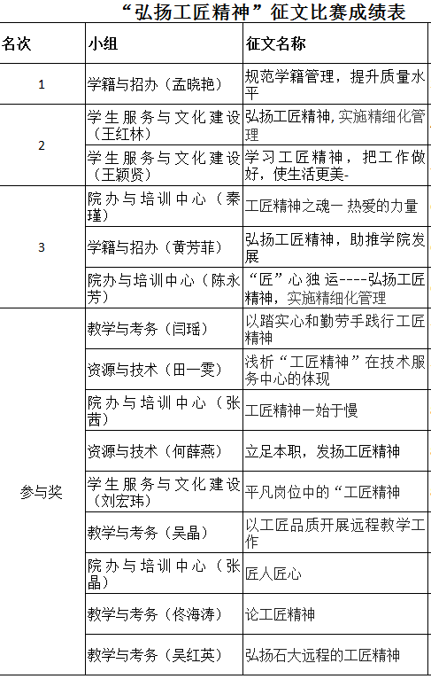 为大力弘扬一丝不苟、精益求精的工匠精神,培育尽职尽责的工作态度和真抓实干的工作作风,在学院形成崇尚工匠、学习工匠、争当工匠的浓厚氛围,激发全员活力,全力构建学院核心竞争力,成人教育学院(远程教育学院)党支部、工会于9月19—10月29日开展“弘扬工匠精神, 实施精细化管理”的有奖征文活动。共有15人参加比赛。