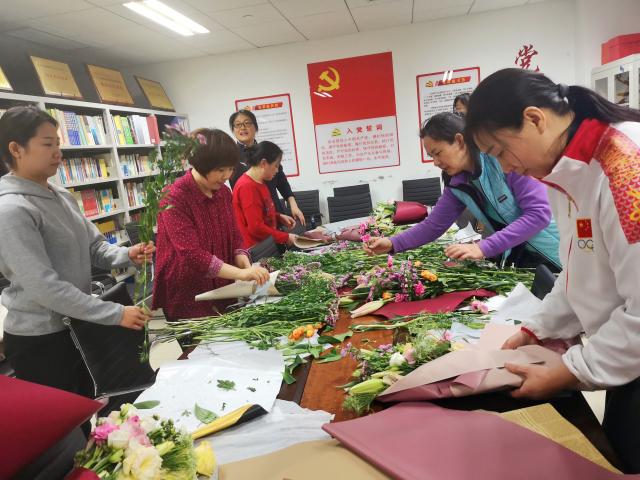 会议室鲜花团簇,由李玲老师为大家讲解花的品种、色彩搭配和造型设计等知识,并展示了从选花、插花到包装的步骤,在李玲老师的指引和帮助下,大家积极创作,沉浸在自己的作品之中,互相合影留念,都不愿错过这有意义的美好瞬间。