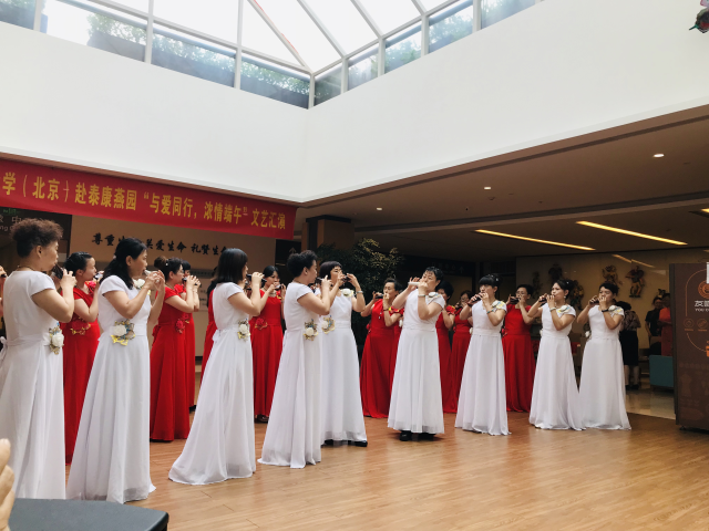 ] 6月7日15:00正值端午节之即,我校教工陶笛协会、合唱团、模特队、舞蹈队、京剧社等5个社团60余人与泰康养老社区的居民和照护人员同台演出。校工会常务副主席王仲民、泰康燕园护理总监马英出席大会。