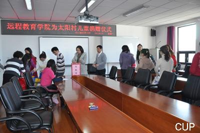 太阳村是以无偿为服刑人员代养代教未成年子女的公益组织,主要经费来源靠社会捐助。为帮助这些孩子们,学院于3月15日专门举行了捐款捐赠仪式。共收到员工们捐出的衣物、文具、书籍、玩具等500余件,捐款2940元。党支部和工会将所得捐赠款项全部用于给太阳村的孩子们购买米、面、油、玩具、书包、文具等生活和学习用品,表达了远程教育学院全体职工对孩子们的关怀和祝愿。