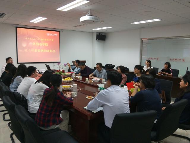 2019年9月12日周四14:00,外国语学院在主楼A724召开外国语学院三十年教龄教师表彰会,近二十名教职工和学生代表参加了此次活动。表彰会由学院工会主席杜芳芳主持,分党委书记李玉财,院长赵秀凤,受表彰的教师,部分教师和学生代表出席了活动。
