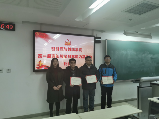 新能源与材料学院于2019年11月19日在四教207成功举办了学院第一届青年教师教学能力基本功比赛。比赛参照学校教学比赛的要求,选手们提前准备50分钟完整的教案设计以及15分钟的讲授内容,由教务处王爱军副处长、地球科学学院陈冬霞副院长、经济管理学院郝洪教授及学院教学专家组、教学指导委员会共7名老师组成了评审组,特邀4名学生做学生评委。比赛共有10名青年教师进行现场授课,经过精心准备,参赛教师们语言流畅、条理清晰,教学特色鲜明。最终,本次比赛一等奖获得者为詹洪磊、李勃天,二等奖获得者为王晓胜、高旸钦、李迎超,此外李迎超、李勃天两位老师还分别获得优秀教案奖、最受学生欢迎奖,并由受邀评委为以上获奖教师颁奖。