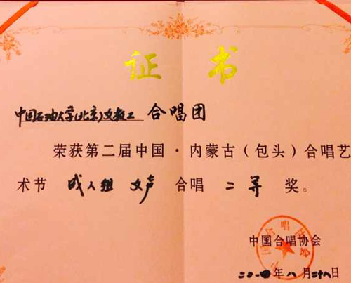 由文化部全国公共文化发展中心、包头市人民政府、中国合唱协会共同主办;包头市文化广播电影电视局、内蒙古合唱协会联合承办的第二届中国·内蒙古(包头)合唱艺术节于2014年8月25日至29日在内蒙古包头市举行,石大教工合唱团在此次比赛中获成人组女生合唱二等奖第一名,一等奖空缺。本届合唱艺术节以“着力群众文化建设,推动公共文化发展”为主题,邀请到了来自全国20多个省市自治区共35支优秀合唱代表队,2000余人参加。由中国合唱协会和内蒙古合唱协会的专家组成评委会,以公平、公正的原则进行全程评判。