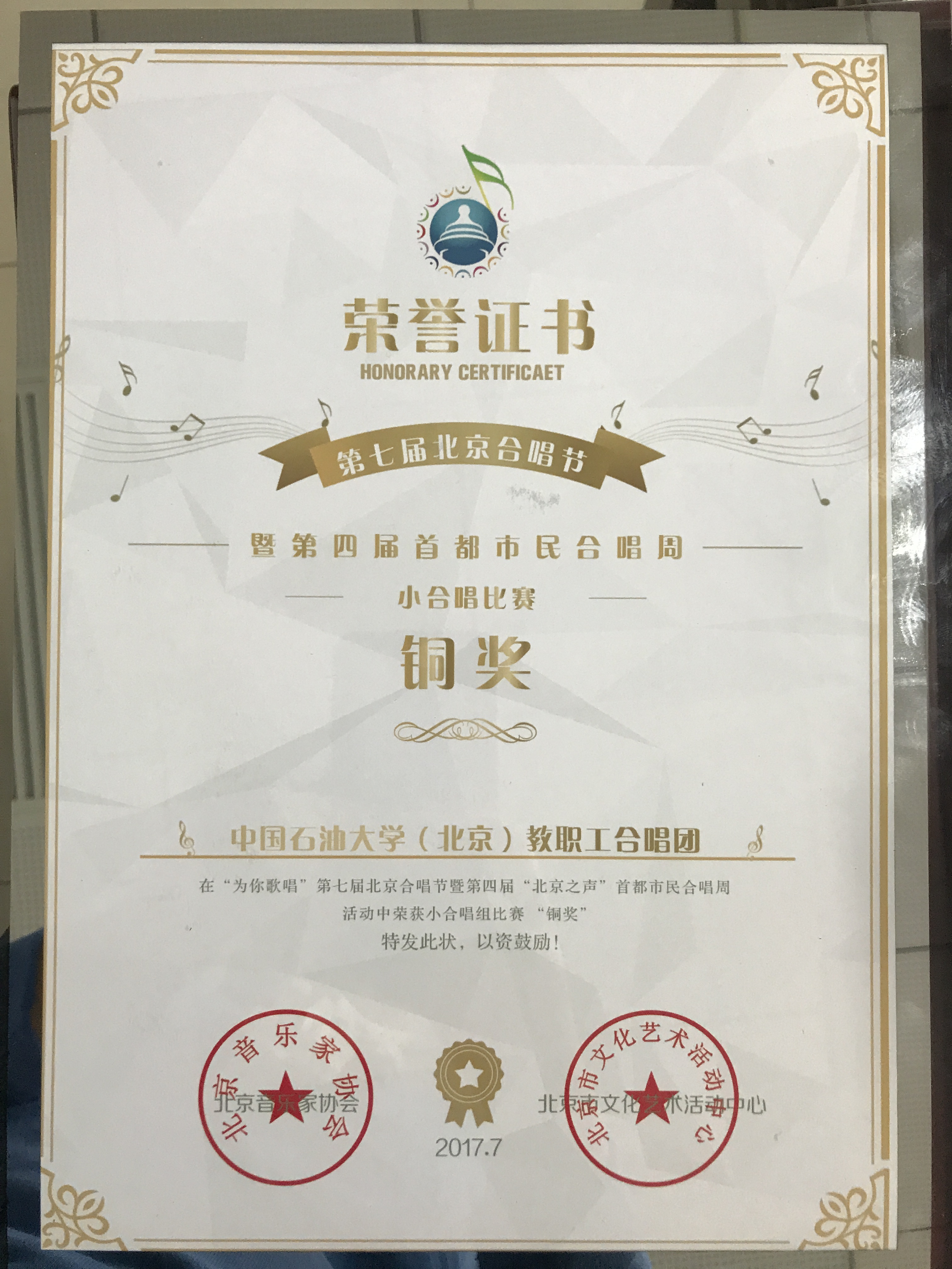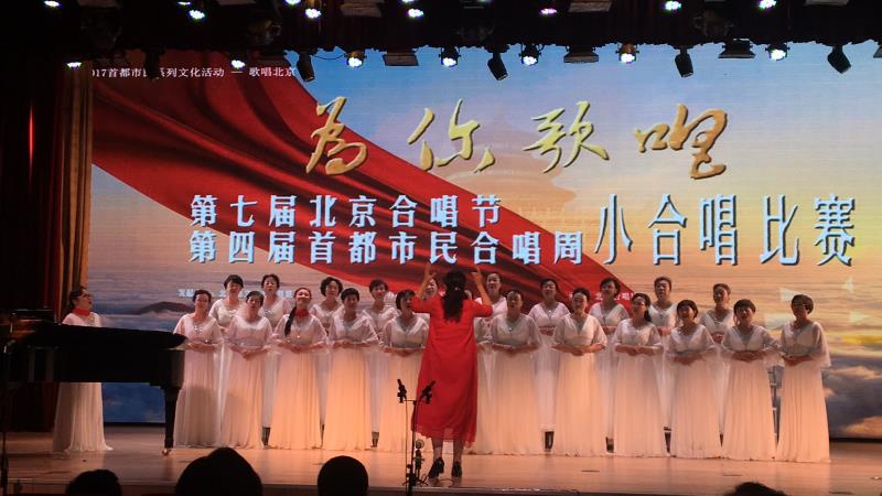 2017年8月25日,为迎接党的十九大召开,我校教职工合唱团参加了由北京音乐家协会、市教委艺教委等单位共同主办的“为你歌唱——第七届北京合唱节暨第四届首都市民合唱周小合唱组比赛。我校参赛的曲目有【我和我的祖国】和【葡萄园夜曲】,合唱团员不畏酷暑在暑假期间通过大家的共同努力刻苦训练,比赛取得了优异的成绩,获得了铜奖;本次小合唱组比赛由全市43支合唱团队同台竞技参与角逐,有许多优秀的合唱团队,给更多合唱爱好者展示自我的机会。