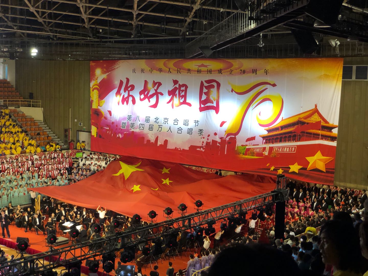 ] 5月24日下午,我校教职工合唱团30名团员参加了“你好祖国”第八届北京合唱节暨第四届万人合唱季开幕式活动,来自首都各界的100支合唱团近5000人汇聚在北京大学生体育馆,我们在这里挥舞国旗,共同高歌,唱响对祖国70华诞的美好祝福,抒发对祖国的真挚情感。