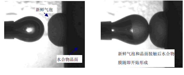 根据本项目提出的双过程机理,水合物形成的控制步骤是基础水合物的形成,也即水合物晶格的形成过程,而小分子气体在连接孔中的吸附为一个快步骤,可以假设为平衡过程。因此,研究水合物的生成动力学,关键要解决水合物晶格的生成动力学问题。考虑到直接测定水合物的晶格生长速率尚不可能实现,本项目通过研究水合物膜生长来研究晶格生长规律。由于气-水互溶度低,水合物主要以膜的形式在气-水界面生成,水合物膜生长可以部分反映水合物晶格生长规律。但国际上还没有定量测定膜生长速率的可行方法。为此,本项目开发出了一种定量测定膜生长速率的可视化方法,如图2所示。