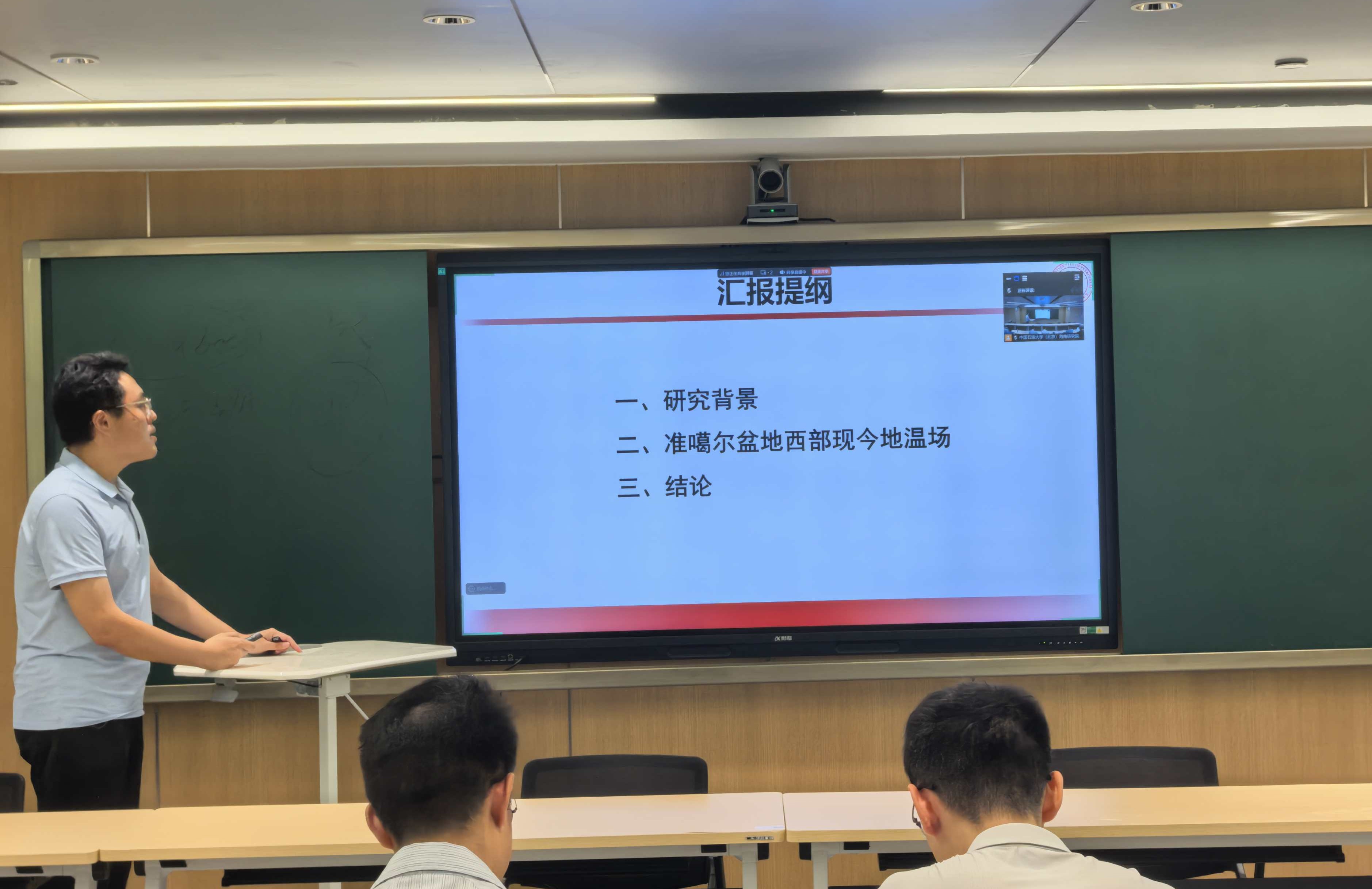 派驻研究生徐甲博、伍正宇、梁佳贞、樊依霖分别做《准噶尔盆地西部现今地温场特征研究》《页岩油分子团簇的流-固耦合——纳米限域体系下页岩油微运移机制》《琼东南盆地长昌-北礁凹陷层序地层划分对比》《海底峡谷汇流过程对盐底辟响应的定量分析》主题汇报。
