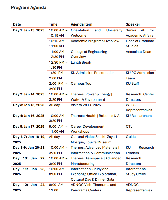作为我校“碳中和、能源绿色转型与国际胜任力”系列出国活动之一,“阿联酋哈利法大学冬令营”项目已于今年年初首次举办,我校学生参加并取得了较好的成效。2025年1月,哈利法大学将再次举办冬令营,并继续邀请我校学生参加。本项目为全英文语言环境,对所有学生免学费,现已启动报名,欢迎有意向参加的同学们踊跃报名,详情如下: