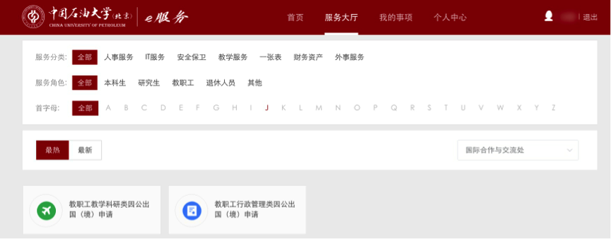 1. 登录校园网e服务办事大厅,在服务分类中选择“外事服务”或在搜索框中选择“国际合作与交流处”,弹出“教学科研类”和“行政管理类”因公出国(境)流程;根据出访类型,选择进入相应流程。