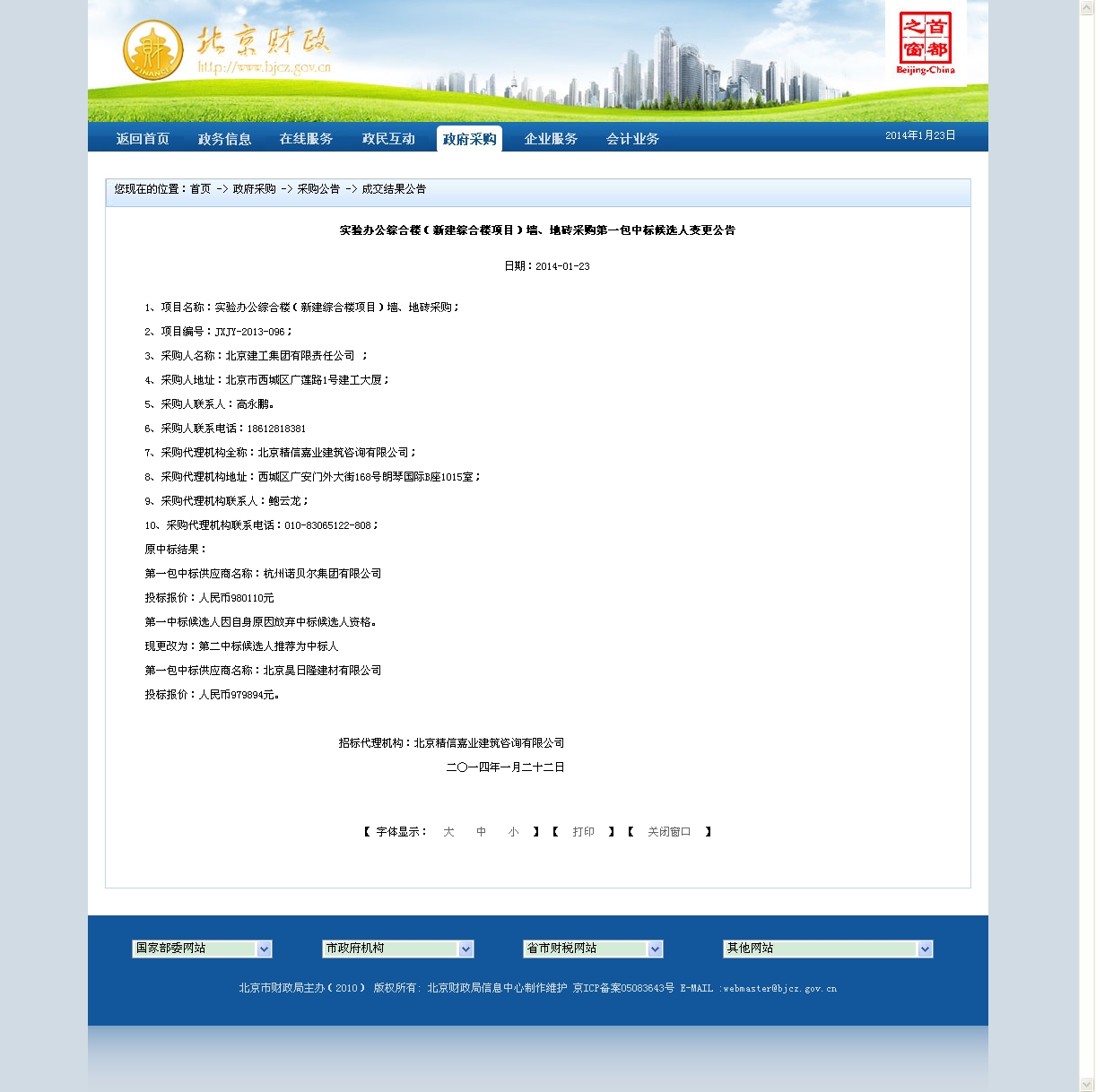 北京市财政局中国石油大学(北京)实验办公综合楼(新建综合楼项目)墙地砖采购中标候选人变更公告