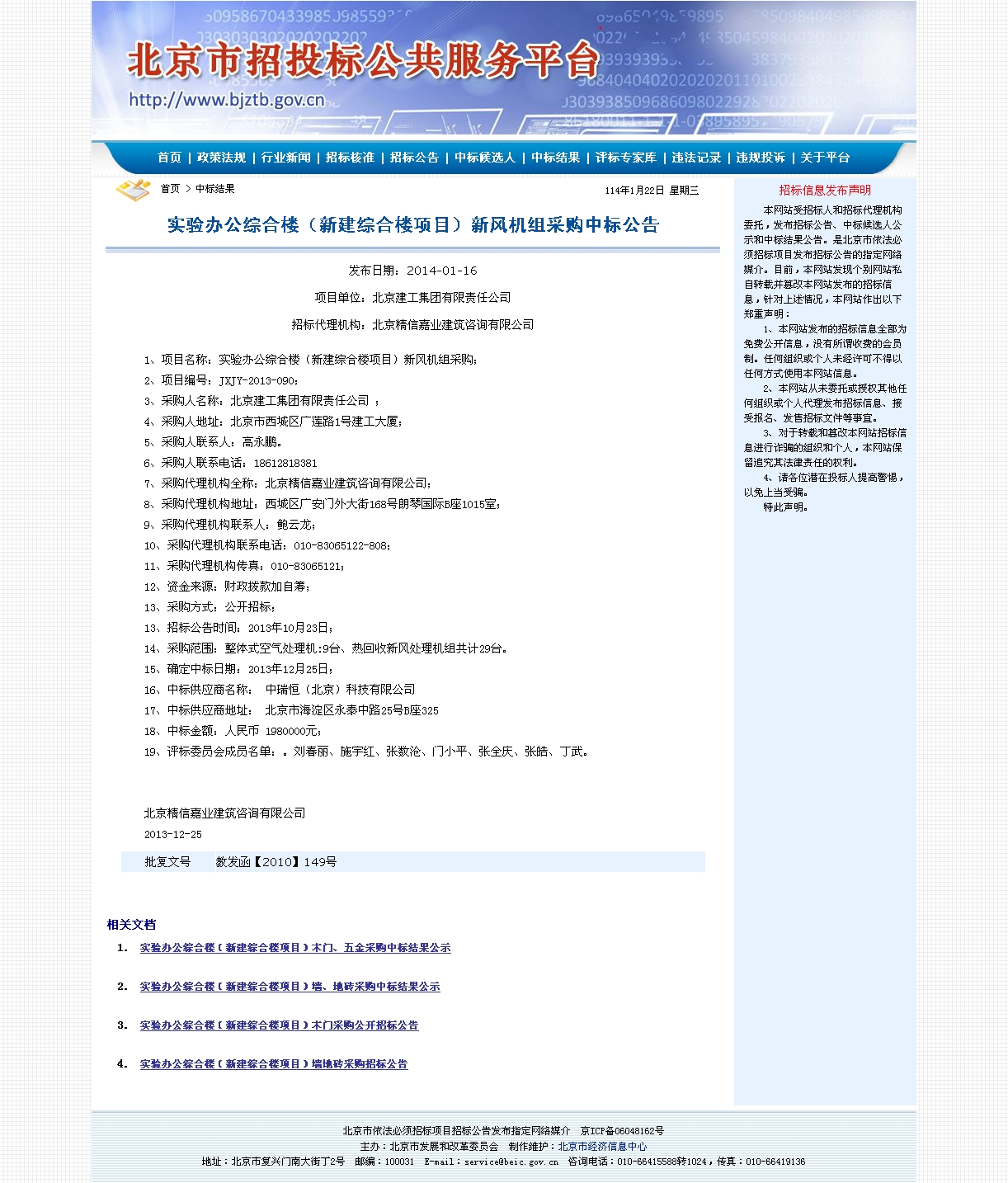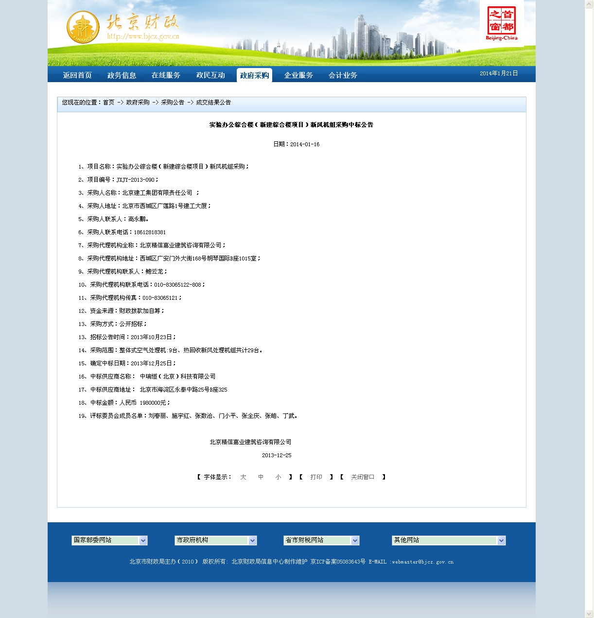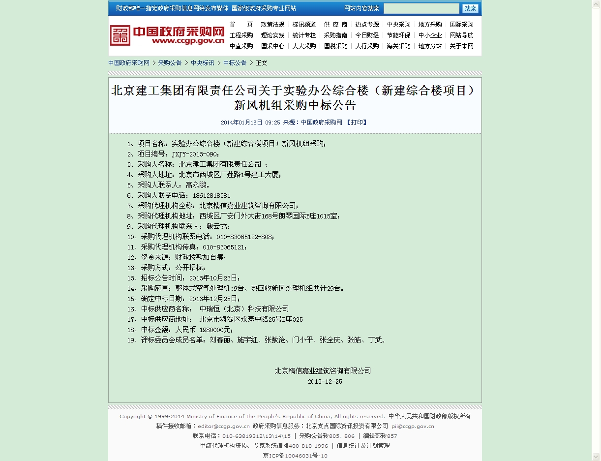 北京市财政局网站实验办公综合楼(新建综合楼项目)新风机组采购中标公告: