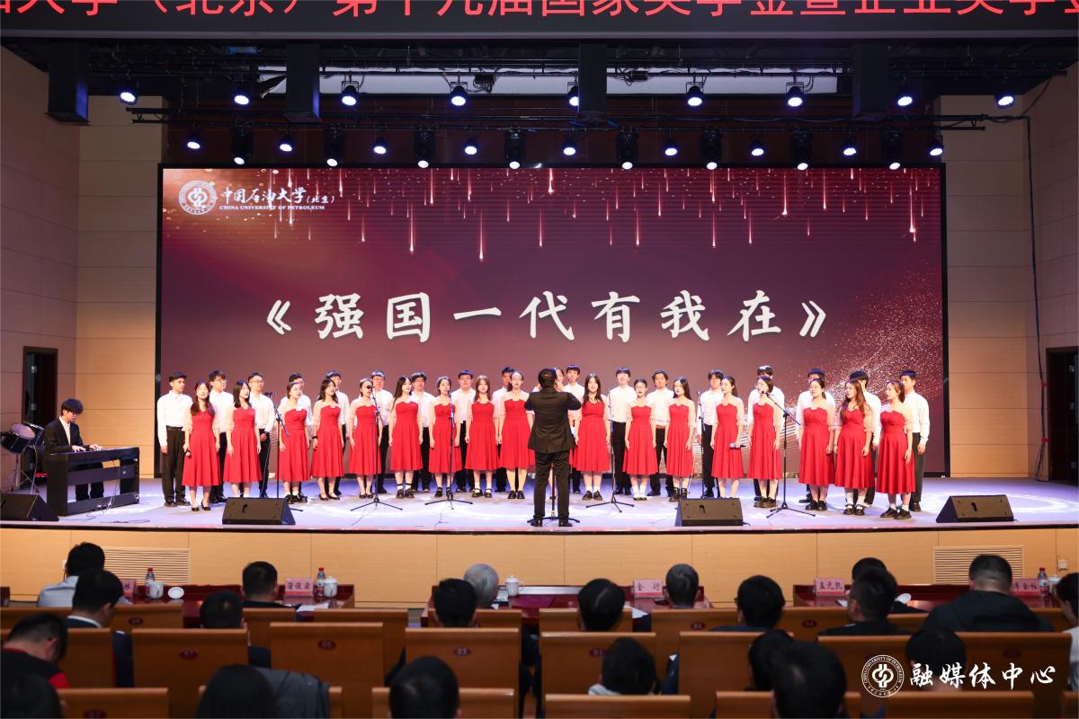 颁奖典礼在大气恢弘的管弦乐合奏《不惧风暴》中拉开帷幕,以“立能源报国大志向 做挺膺担当奋斗者”为主题,通过“弦歌”“誓言”“风华”三个篇章,由获奖学生代表开展了主题讲述。在“弦歌”篇,与会嘉宾师生观看了学校专题宣传视频《扶光》,视频以青春视角开展创新讲述,分享看见光、追逐光、成为光、发散光的成长之路。奖学金获得者冯浩晖、郭文宣、蒋昆以原创诗朗诵《弦歌》表达了新时代学子心中的感恩之情,回顾了学校艰苦创业的奋斗历程,展现了新时代大学生的青春风采。在“誓言”篇,国家奖学金、校十佳大学生获得者、北京大学在读博士生赵冰珂,国家奖学金、中国石油奖学金、万华化学集团奖学金获得者刘庆炽,分享了他们坚持脚踏实地、书写青春梦想的故事。在“风华”篇,国家奖学金、孙越崎优秀学生奖获得者、捐献造血干细胞志愿者张壮壮,宿舍全员保研的本科生代表刘家懿,王涛英才奖学金获得者哈森,共同讲述“风华映初心 创新筑匠心”的成长经历,分享了他们用行动诠释生命关爱、追求创新、敢于担当的情怀。大学生合唱团演唱《强国一代有我在》。颁奖典礼在校歌《我为祖国献石油》的歌声中落下帷幕。