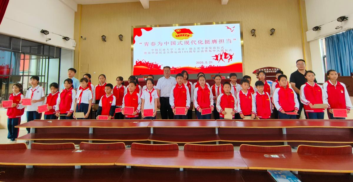 5月21日下午,云南省南华县思源实验学校举办中国石油大学(北京)励志奖学金发放仪式暨南华县纪念五四运动106周年示范性集中入团仪式。学校挂职干部、南华县副县长张自强,团县委、思源实验学校主要负责人、中石大研支团及100余名学生参加。